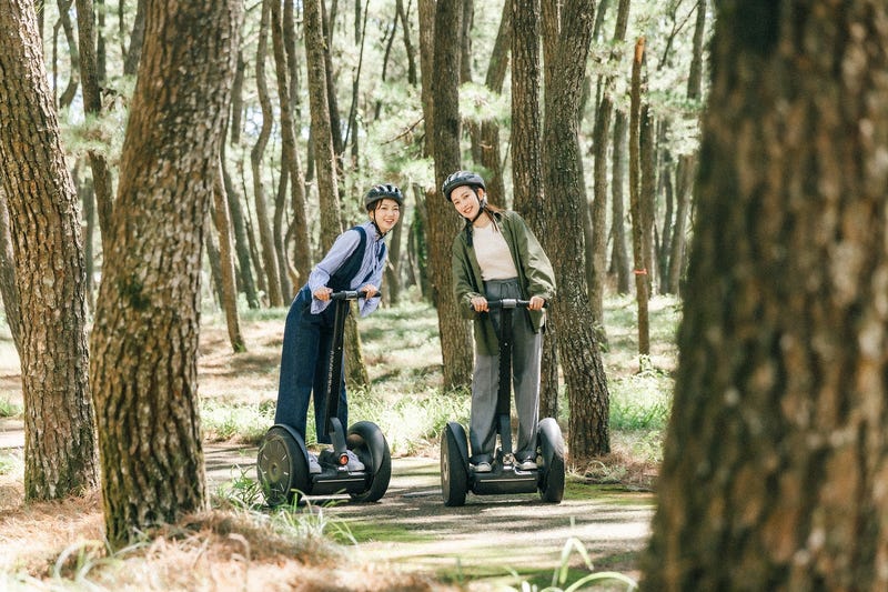 | ②乗車講習 | セグウェイで安全にコースを散策するための基本的な乗車技術を身につけていただきます。セグウェイ社公認インストラクターがゆっくり丁寧にレクチャーいたしますので、初めての方でも安心して乗車することができます。参加者の皆さんが上達したところで、散策へ出発! ※上達具合により時間が前後する場合があります。 |