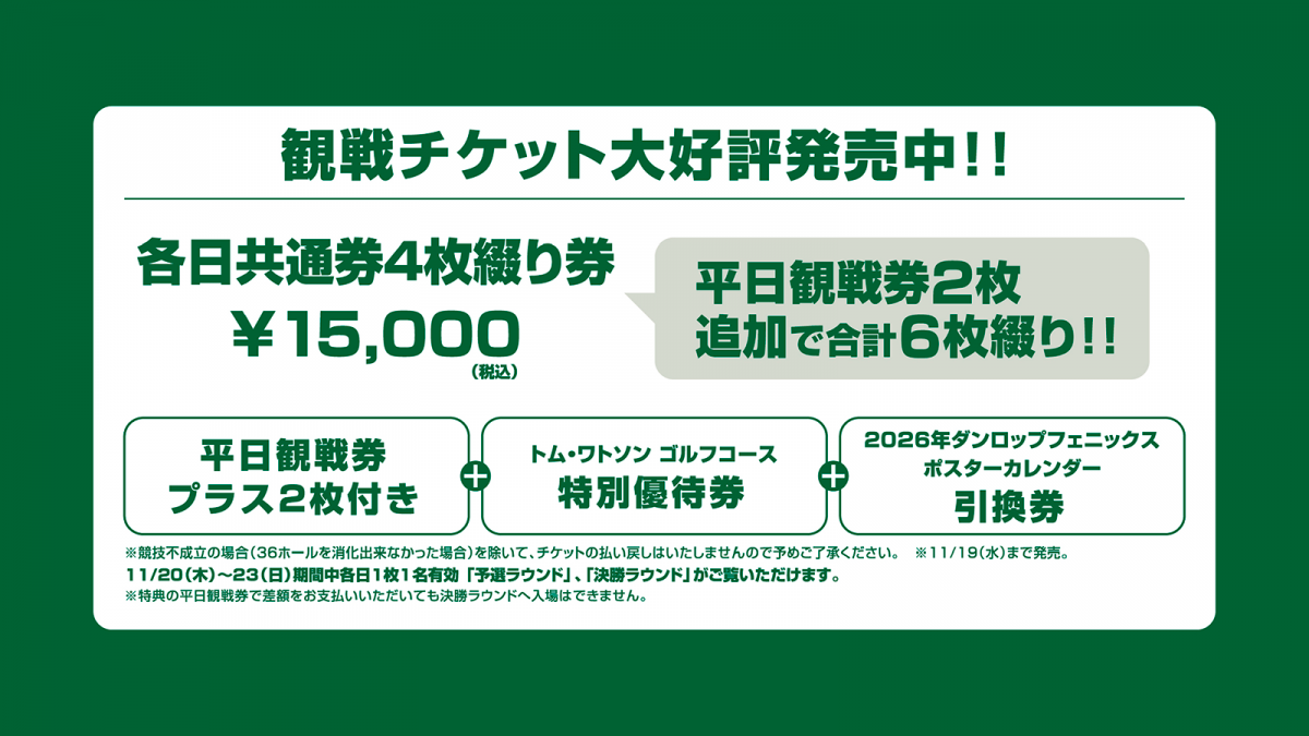 ※競技不成立の場合(36ホールを消化出来なかった場合)を除いて、チケットの払い戻しは致しませんので予めご了承下さい