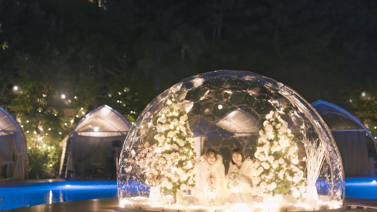 フェニックス・シーガイア・オーシャン・タワーに隣接する宿泊者専用のガーデンエリア「THE LIVING GARDEN」に夜空の星が舞い降ります。たくさんのあかりが灯った水辺は、まるで星降るガーデンのよう。プールサイドにスノードームや三日月型オブジェが、焚火のリビングにはあたたかな光に包まれた幻想的なフォトスポットが今年も登場します。