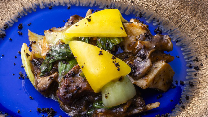 ・宮崎ハーブ牛とキノコの発酵黒豆炒め
