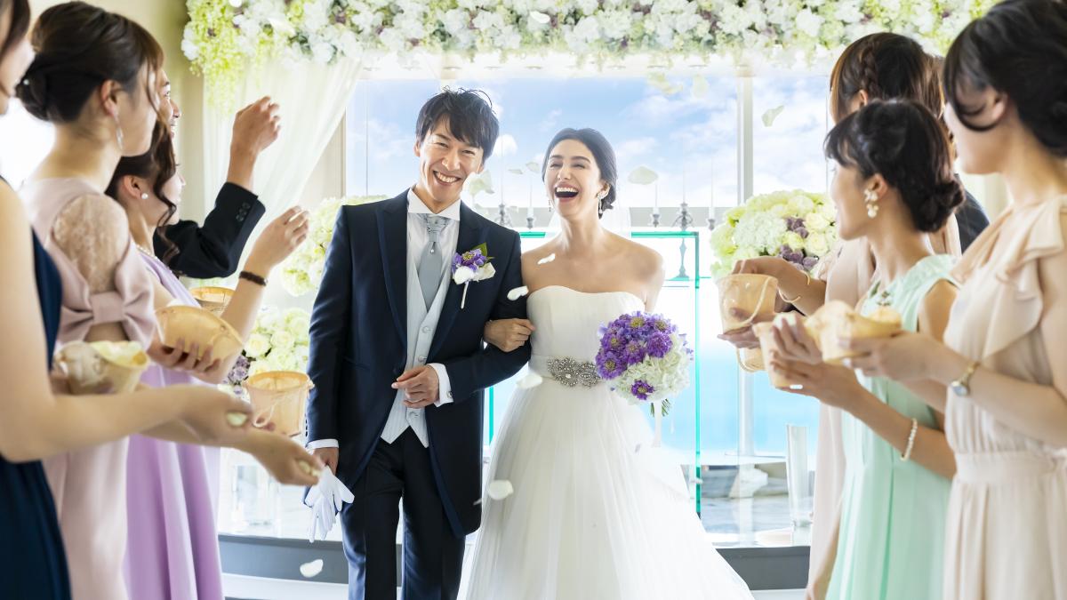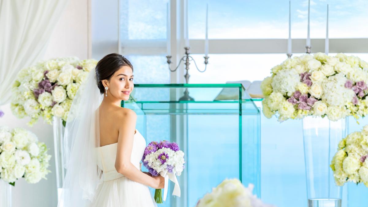 純白の空間と空と海の碧のコントラストが非日常感を演出し、ふたりの始まりの瞬間をドラマティックに映します。