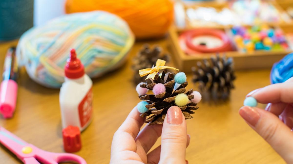 ホテル裏の黒松林で拾った松ぼっくり、ビーチに漂着した流木やシーグラスを集めて、オリジナルの松ぼっくり飾りクラフト体験♪