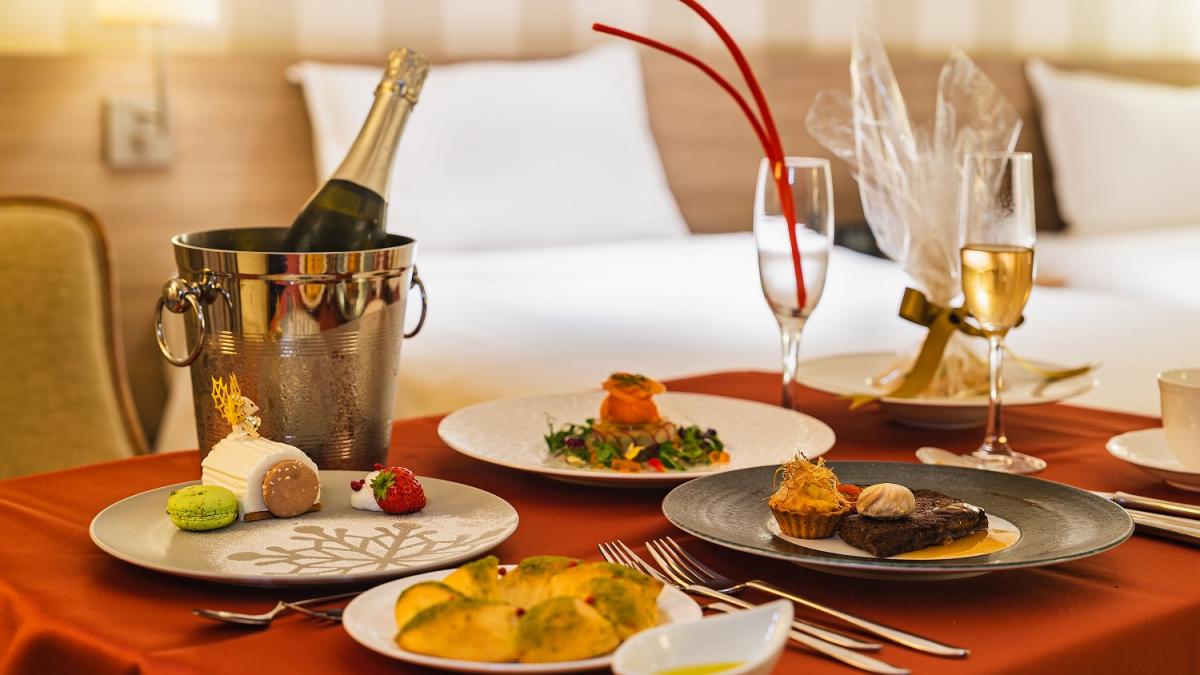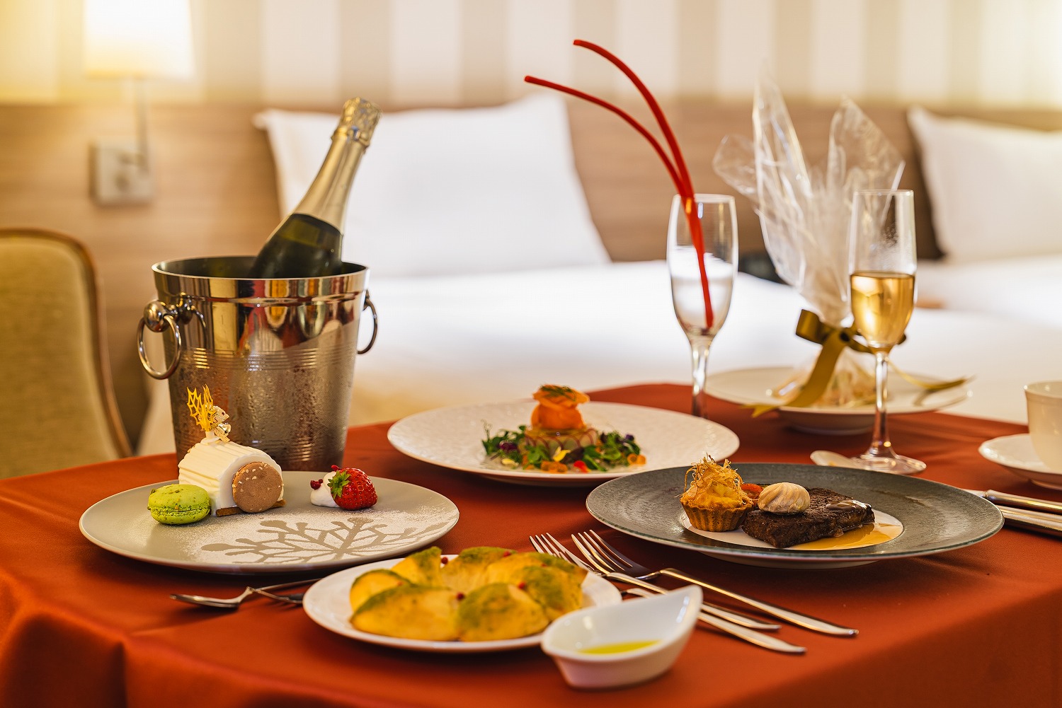 特別なクリスマスディナーをルームサービスにてお届けします。スパークリングワインハーフボトルの特典付き!