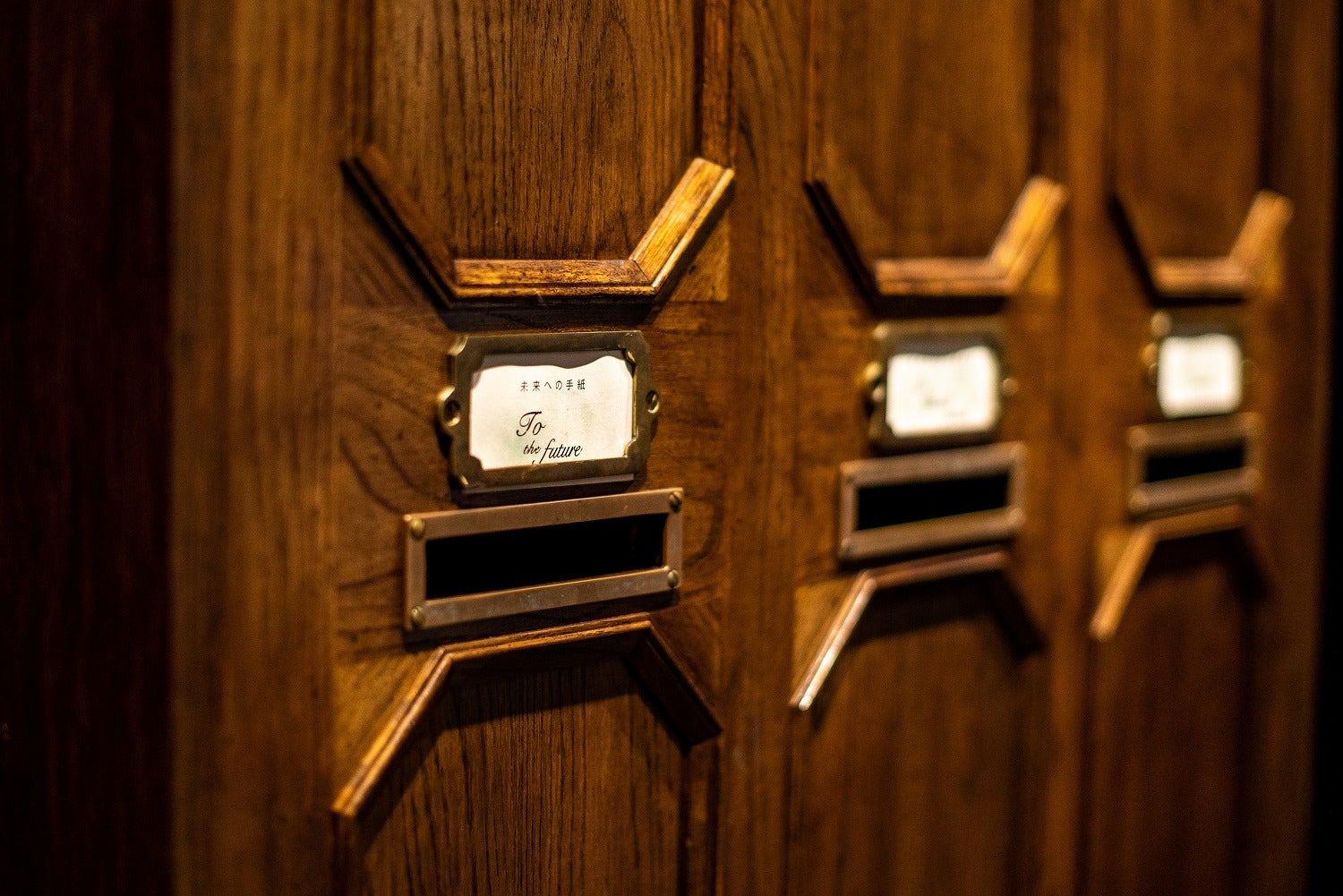 英国のアンティーク家具をリメイクしたポストには3つの投函口が用意されています。“大切なひとへの手紙”と書かれた投函口に入れると切手代をホテルが負担し郵送。(海外もOK)