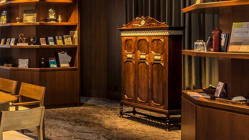 英国のアンティーク家具をリメイクしたポストには3つの投函口が用意されています。“大切なひとへの手紙”と書かれた投函口に入れると切手代をホテルが負担し郵送。(海外もOK)