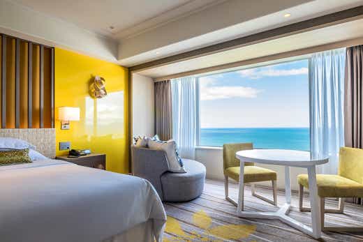 広大なリゾートエリアの中心に位置するフェニックス・シーガイア・オーシャン・タワーは、地上154m、全客室東向きのオーシャンビュー。雄大な太平洋から昇る朝日、宮崎の明るい日差しが映し出す色鮮やかな海と空の青と松林の緑、美しい芝の緑が浮かび上がるナイターゴルフ、そして満月の夜に現れる幻想的な月の道など、シーガイアならではのダイナミックなロケーションを独り占めいただけます。