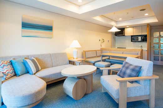 2025年7月、ロビー&客室がリニューアル! より上質な空間へと生まれ変わりました。海と松林に包まれたシーガイア・フォレスト・コンドミニアムは、全室72㎡の広々とした和洋室で、キッチン・洗濯乾燥機完備の快適な滞在をお約束します。ご家族やグループでの長期滞在や合宿にもぴったり。まるで別荘のようなリゾートステイをご堪能いただけます。