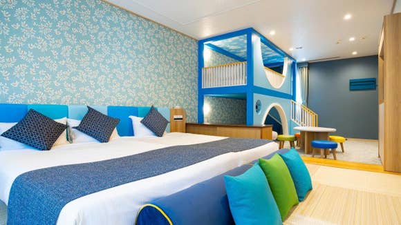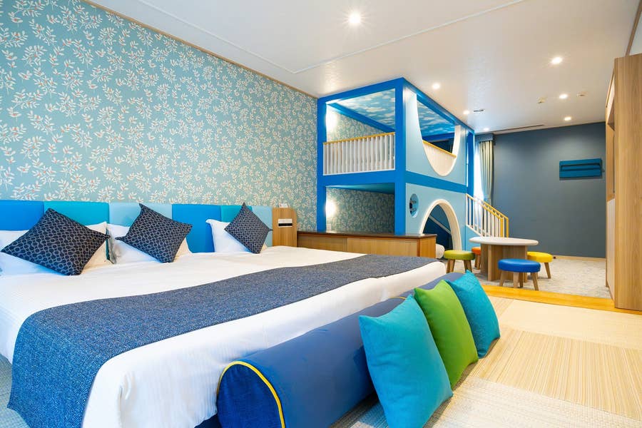 お子様用の、ブルーを基調とした2段ベッドを新設しました。大人も子供も日常では体感できない、