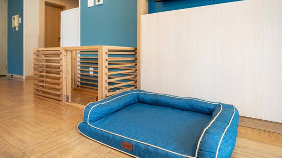 ポップなカラーの室内には、木製ケージやベッドなど、あたたかみのあるペット専用グッズもご用意しました。
