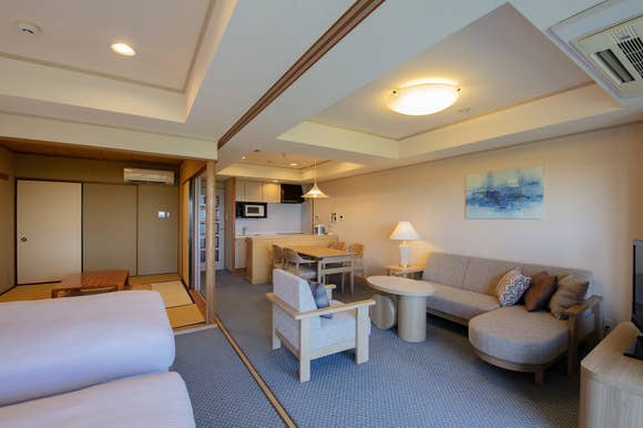 畳の心地よさはそのままに、現代的なデザインとやさしい色合いが調和した客室で、ゆったりとしたひとときをお過ごしください。