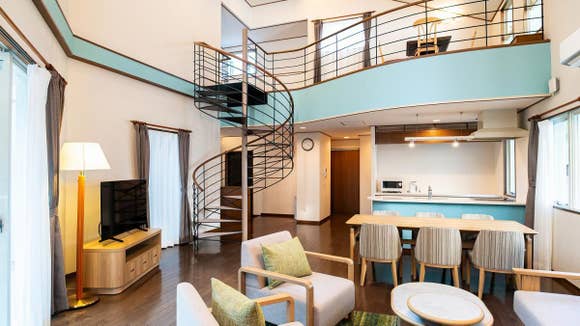 自然のやさしさを感じられるナチュラルなファブリックを取り入れ、カウンターや螺旋階段の壁面には爽やかな水色をアクセントに。