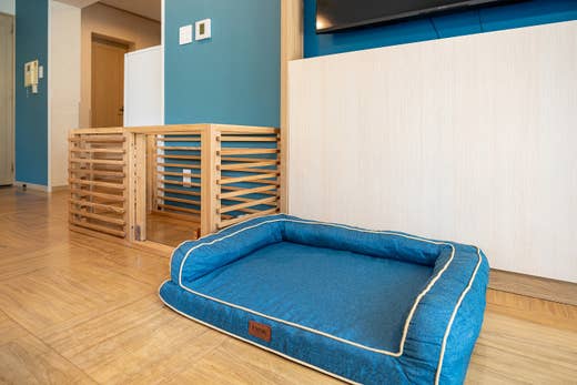 ポップなカラーの室内には、木製ケージやベッドなど、あたたかみのあるペット専用グッズもご用意しました。