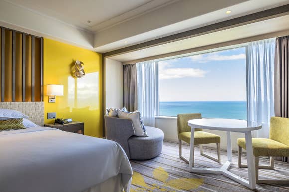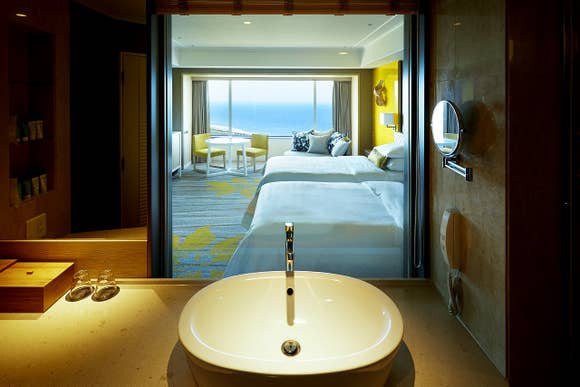 ベッドサイドには大きな回転式ソファーをご用意。お部屋での会話、大きな窓からの絶景を心ゆくまでお楽しみいただけます。