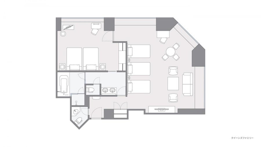 プリズム型の頂点部分、一番海に近い位置に面したスイートルームのお部屋です。ワイドな窓から、最も美しく日向灘のパノラマを見る事ができます。112平米の広々としたお部屋に、ゆったりしたベッドが5つ設置されています。ご家族やグループに人気のお部屋です。