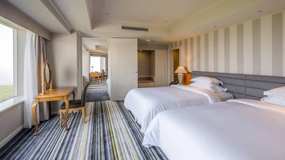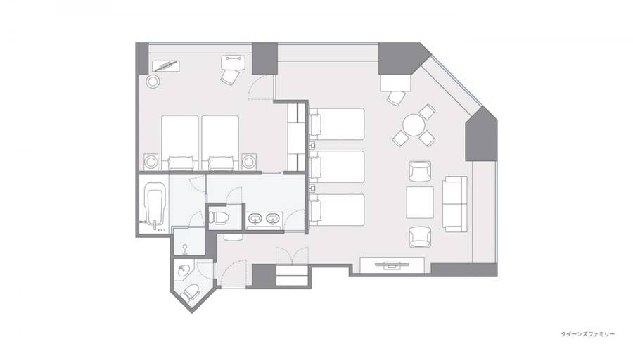 プリズム型の頂点部分、一番海に近い位置に面したスイートルームのお部屋です。ワイドな窓から、最も美しく日向灘のパノラマを見る事ができます。112平米の広々としたお部屋に、ゆったりしたベッドが5つ設置されています。ご家族やグループに人気のお部屋です。