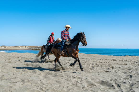 初心者やお子様にはスタッフが先導・同行しますので、安心してご参加いただけます。ミニコースでは、UMAIRUを囲む黒松林の中をゆっくり騎乗。爽やかな黒松林と潮風が心地よい海岸線を両方楽しめる外乗コースも人気です。