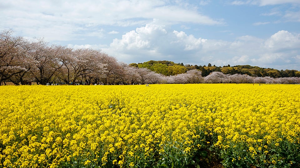 広大な古墳群内に約8haのお花畑が広がります。約800mの桜並木に、約2000本の桜と約30万本の菜の花、そして古墳の見事なコントラストの絶景を楽しむことができます。