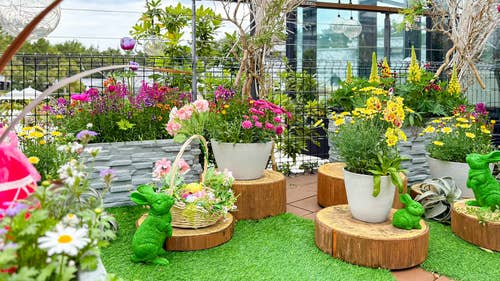 イースターならではのうさ耳や花冠などのヘッドピースを無料貸し出しいたします。春の花々で彩られたガーデンで、思い出に残る一枚を。