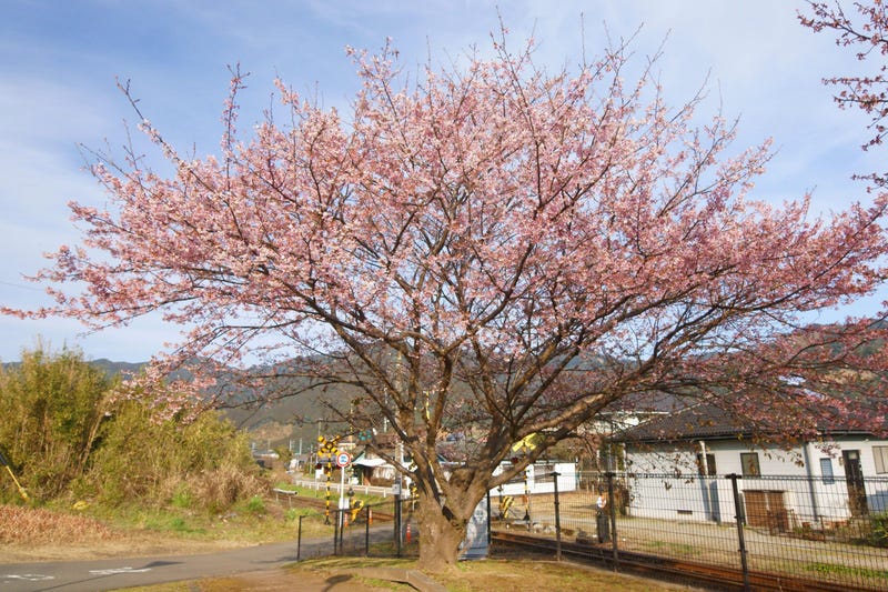 JR日南線北郷駅のホーム西側に植えられている寒い時期に咲く桜です。 北郷町の『松盛園(しょうせいえん)』を管理していた 故・黒木國光さんが 「正月に咲く桜が作ってみたい」という思いから 山桜を交配させて1951年に作り上げ、日本一早く咲く桜として観光スポットになりました。