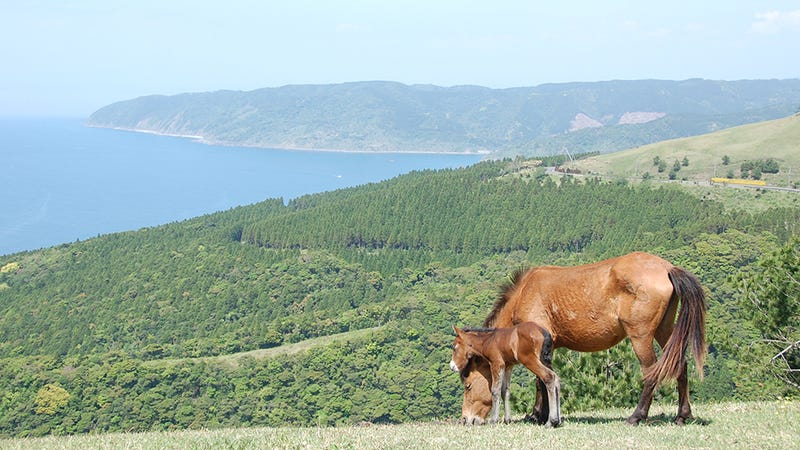 宮崎県の最南端に位置する、太平洋に突き出した都井岬(といのみさき)には江戸時代から約300年に渡って同じように飼育されている「御崎馬」が放牧されています。純粋な日本在来馬で、国の天然記念物に指定されています。春は出産シーズンなので、