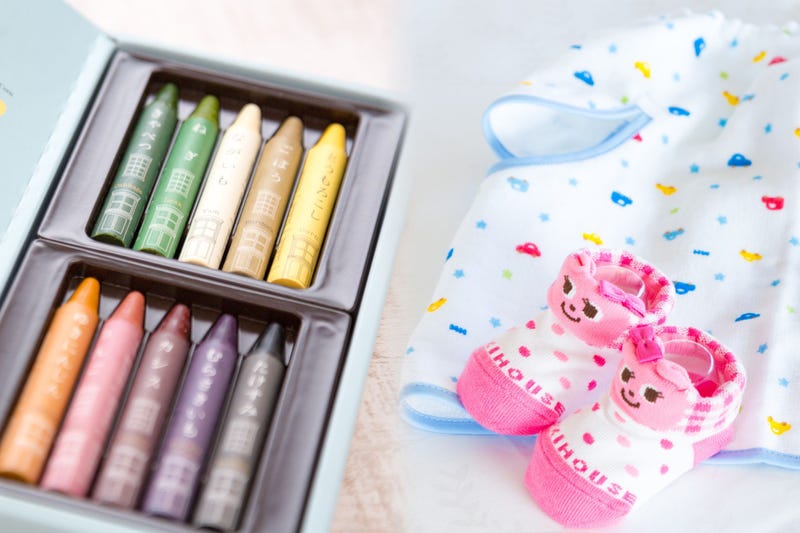 おやさいクレヨン、ミキハウスのエプロンまたは靴下からお好きなものをプレゼント致します。