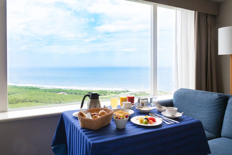 朝食は、お部屋でゆっくり「ルームサービス」、または「パインテラス」のメニュー豊富な和洋ビュッフェ からお選びいただけます。