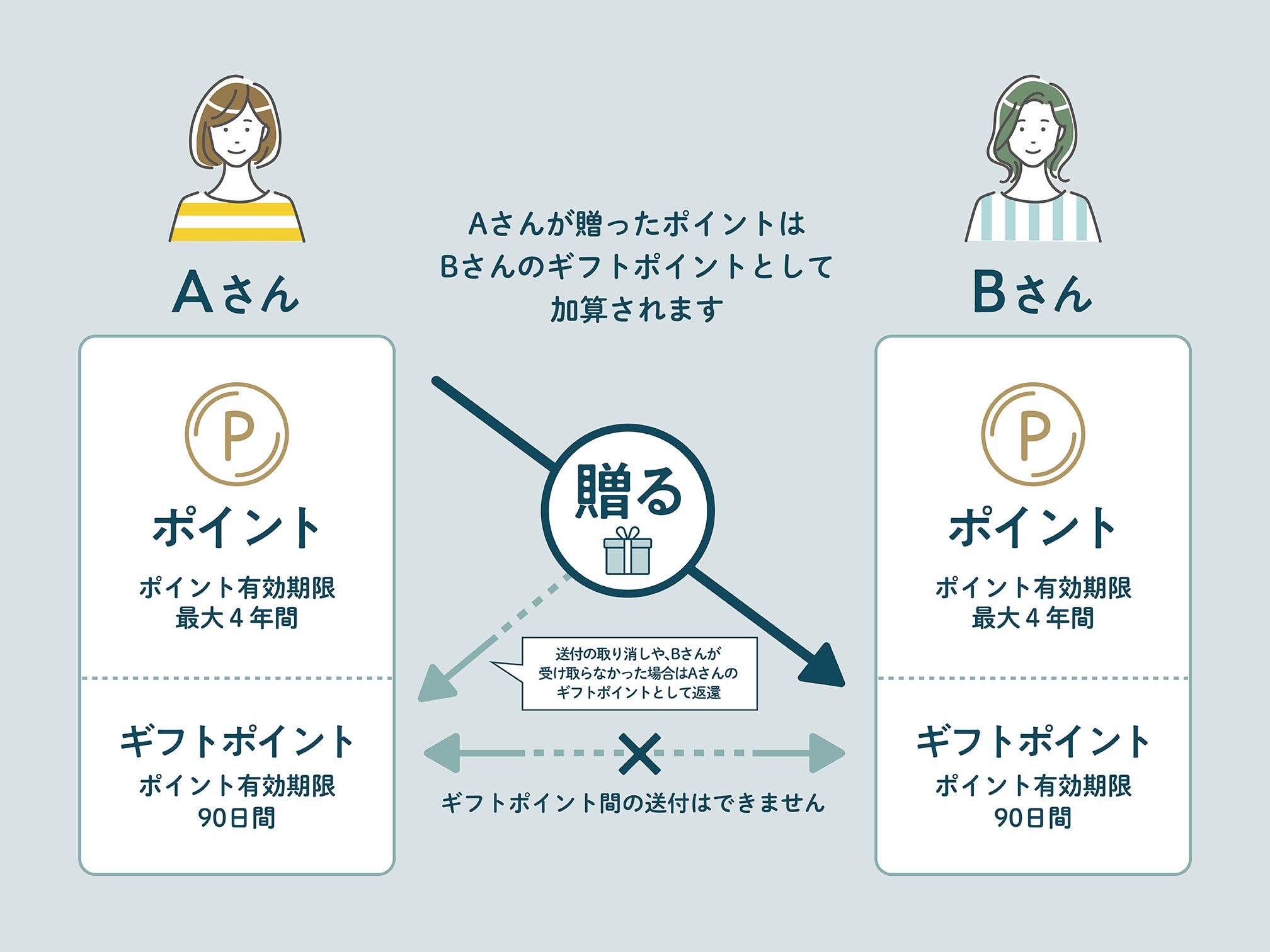 | ギフトポイント | 会員様同士でポイントの送付や受け取りが可能 ※送付・受け取りの上限・有効期限等の詳細は、後日、公式WEBサイトよりご確認ください | - |