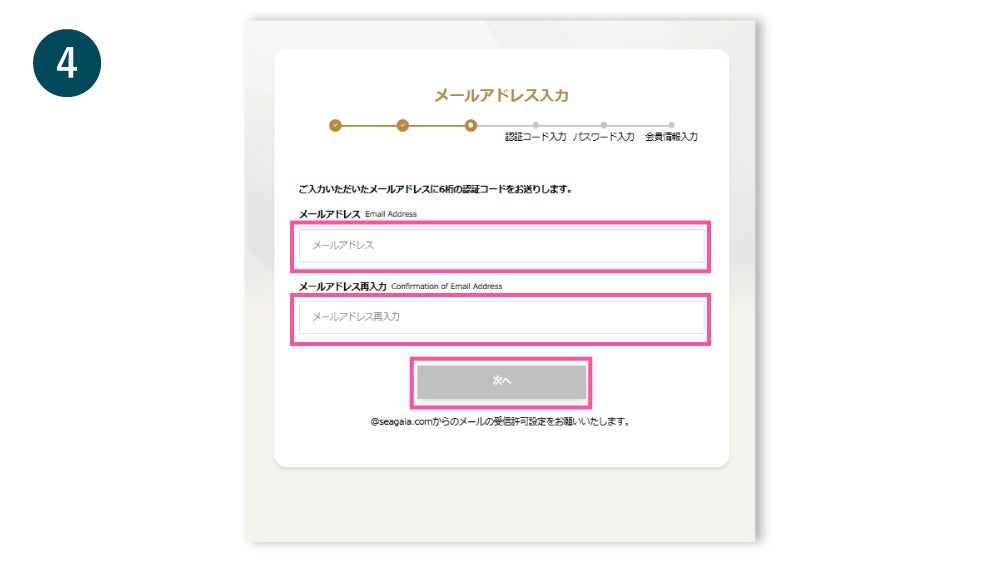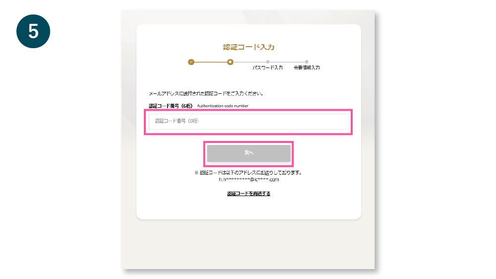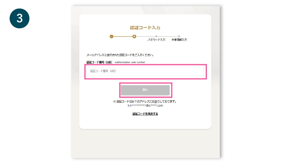 入力したメールアドレスに届いた認証コードを入力し、「次へ」をクリック
