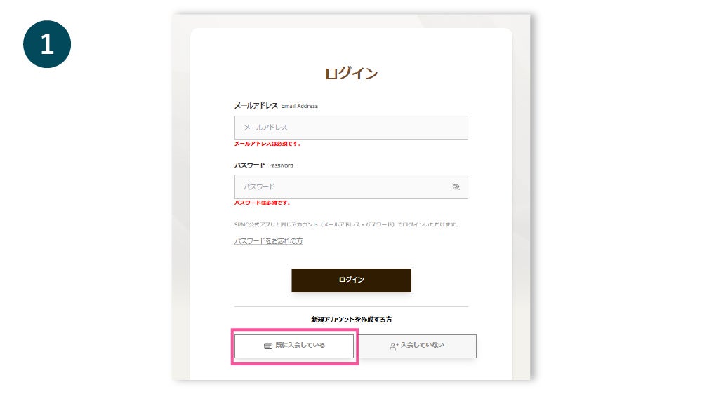 SPMC会員専用サイトを開き、「新規アカウントを作成する方」>「既に入会している」をクリック