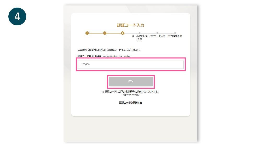 登録電話番号に送付された認証コードを入力し「次へ」をクリック