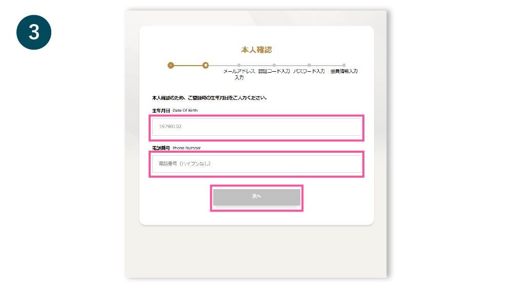 本人確認のため、登録の生年月日と電話番号を入力し、「次へ」をクリック