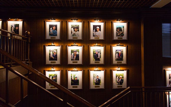 2階に上がる階段には見事優勝の偉業を成し遂げた歴代チャンピオン選手たちの写真パネルが展示されています。