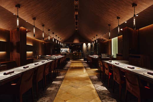 エントランスには、松原賢氏による和モダンな壁画と、ウェイティングスペースとしても利用可能なバーカウンターを新設。待ち時間さえも上質な時間に変えてくれます。鉄板焼きカウンターエリアは、ダークブラウンの壁面に飾り棚を設け、上品で統一感のある空間に仕上がりました。