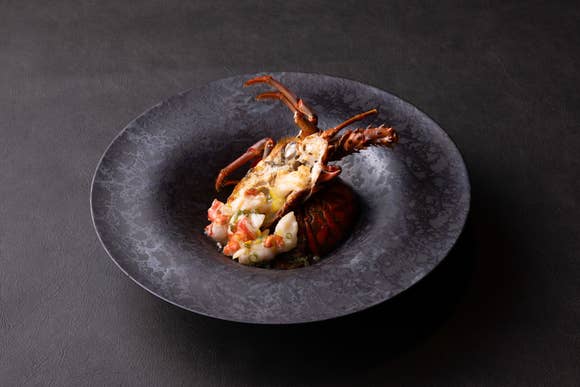 さらに、料理を引き立てる提供皿もリニューアルに合わせて新調されました。テーマである「土」をイメージしたダークトーンの器は、シェフの技と食材の魅力をより深く、そして華やかに際立たせます。焼きたての宮崎牛はもちろん、活き鮑を盛り付けた一皿は、まるで芸術作品のような存在感を放ちます。