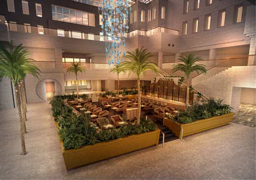 軽やかで快適な座り心地のアウトドアデザイン家具、上質でリゾート的な樹種を多彩に組み合わせた色彩豊かな植栽。南国の植栽に囲われた庭の中で、ゆったりとくつろげるデザインで一新。吹き抜けのアートは、雨や滝、そして光のきらめきを表現し、自然の恵みを空間にそっと降りそそぐ存在に。
