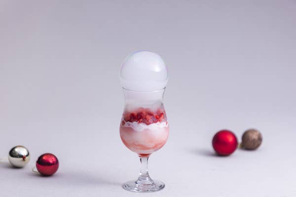 ウォッカをベースに、宮崎発祥の人気ドリンク『ヨーグルッペ』とミルク、はちみつを合わせ、グレナデン・シロップとストロベリーダイスでほんのりピンクに染め上げました。グラスの上の白いバブルが弾けるとともにスモークがふわりと広がり、まるでスノードームを揺らしたような幻想的な光景が目の前に広がります。