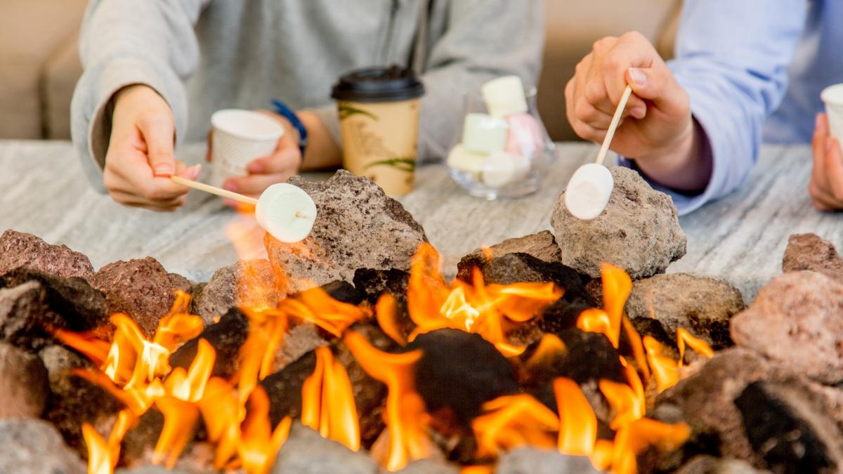 「焚火のリビング」で焼きマシュマロ体験!地元宮崎市にある「なかはら珈琲工場」の豆を使用したコーヒーでゆったりと。そしてゆらめく炎で焼くマシュマロを、いずれも無料でご利用いただけます。 松林に囲まれたオープンエアーの空間で、ゆっくりと流れるリゾート時間をお楽しみください。