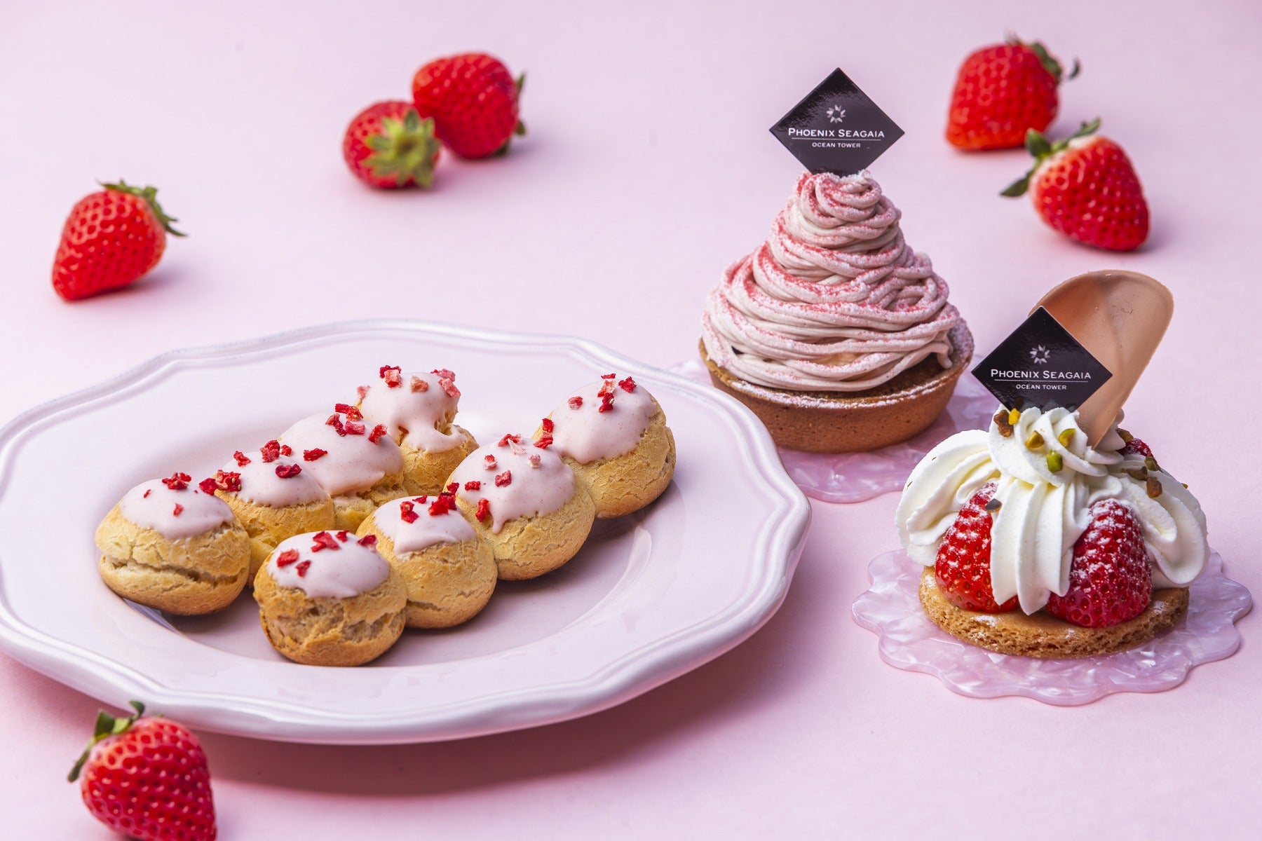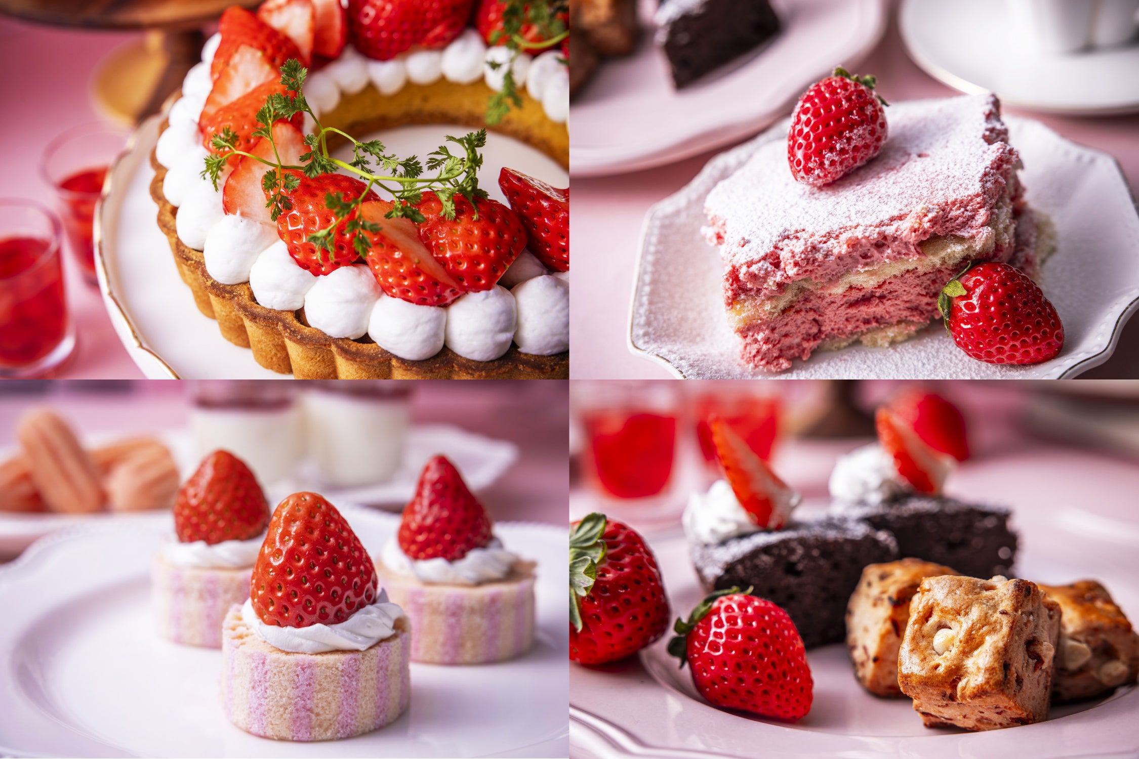 ビュッフェのスイーツコーナーにて、ミルク感のある素材といちごを組み合わせたスイーツを提供します。ふんわり軽やかないちごのロールケーキ、いちご香るスコーン、いちごのティラミス、いちご風味のわらびもち、いちご風味のメロンパン、そして、王道のいちごショートケーキなど、目にも華やかなスイーツ達が勢揃い。ディナータイムでは15種類、ランチタイムでは8種類のいちごスイーツをご用意します。