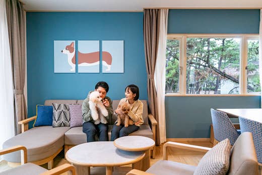 シーガイア・フォレスト・コテージにチェックイン。客室は広々117㎡、リニューアルしたばかりのペットルーム。ポップなカラーの室内には、木製ケージやベッドなど、あたたかみのあるペット専用グッズも!