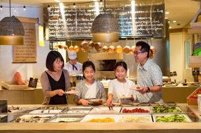 「パインテラス」の朝ごはんは、朝食と昼食を兼ね備えたブランチスタイル。おにぎりやオムレツなど、時間帯で少しずつ変わるメニューも楽しみのひとつです。シーガイアでのご滞在の思い出を語り合いながら、こだわりの和洋ビュッフェを心ゆくまでお楽しみください。