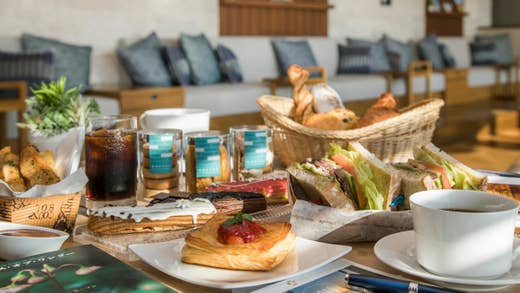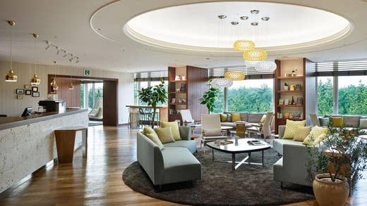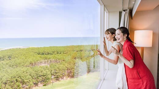 チェックアウトまでのひとときは「風待ちテラス」でコーヒーを片手にゆったりリラックス。大きな窓の向こうに広がる緑豊かな黒松林を眺めながら、お気に入りのソファーでゆったりと過ごします。