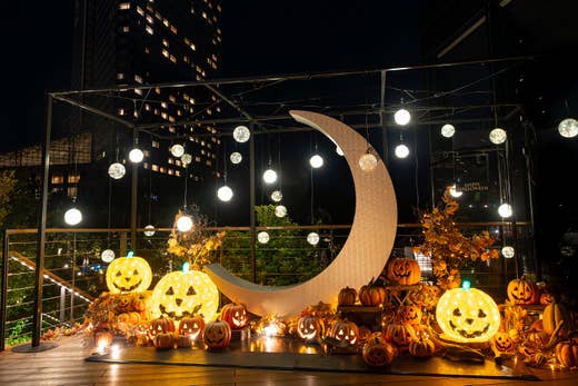 ガーデンエリア「THE LIVING GARDEN」を散策。秋はハロウィン仕様!怪しく輝くランタンでライトアップがされ、ハロウィンナイトを演出♪“KUROBAR”の前のフォトスポットも写真をパチリ。