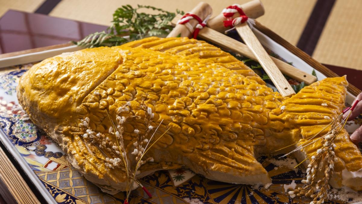 ”ハレの日”をより華やかに彩るおめで鯛(たい)一品に、”鯛の塩釜焼”はいかがですか。鯛は宮崎県産のしまうら真鯛を使用、塩釜を小槌で割ると、ふっくらと蒸しあがったしまうら真鯛が現れます。