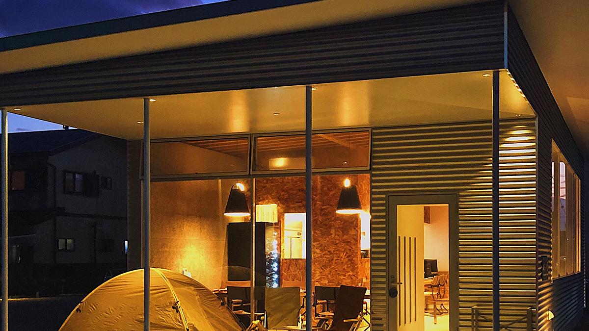 ガラス張りでスタイリッシュな外観に、テーブルや椅子がアウトドアスタイル で統一された内観の「HIKE」。
