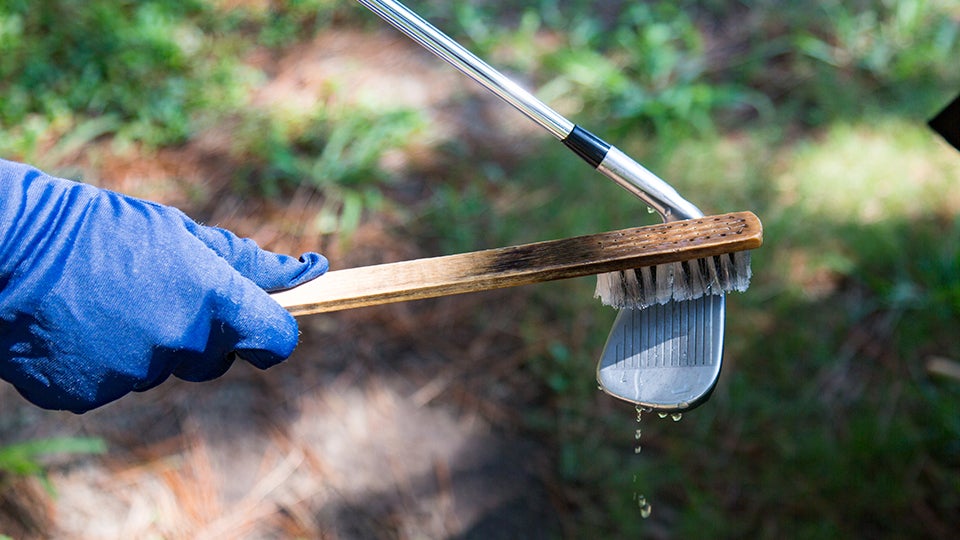 芝や土が入り込こむことでアイアンはスピンがかかりにくくなりるので、フェースをメンテナンスして次のプレーに備えます。
