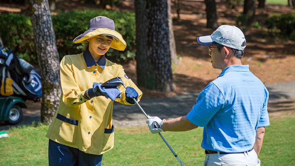 ゴルフバッグを運んだり、指定されたクラブを渡したり、コースやグリーンについての的確なアドバイスをしたりなど、プレー上のケアから、ボールを捜したりなど、状況に応じて対応いたします。ゴルファーの皆様が快適にゴルフを楽しめるように日々お手伝いしております。