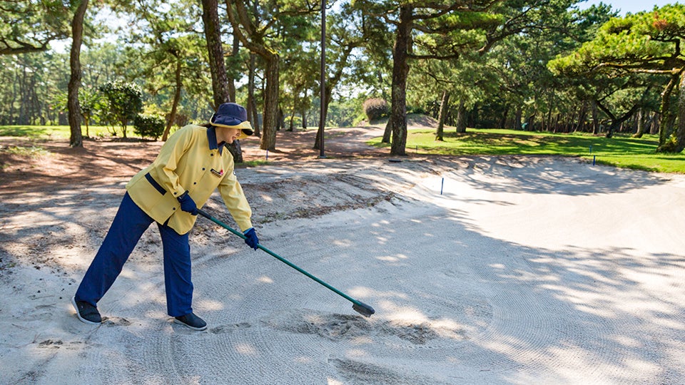 基本プレーヤーがバンカーをならしを行いますが、プレー進行の為に、バンカーならしもご協力いたします。