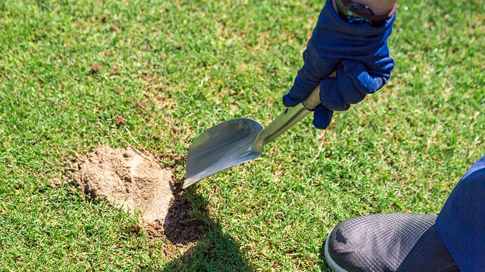 お客様のショット後に後にできるディボット跡は、目土をしてコースをメンテナンスします。