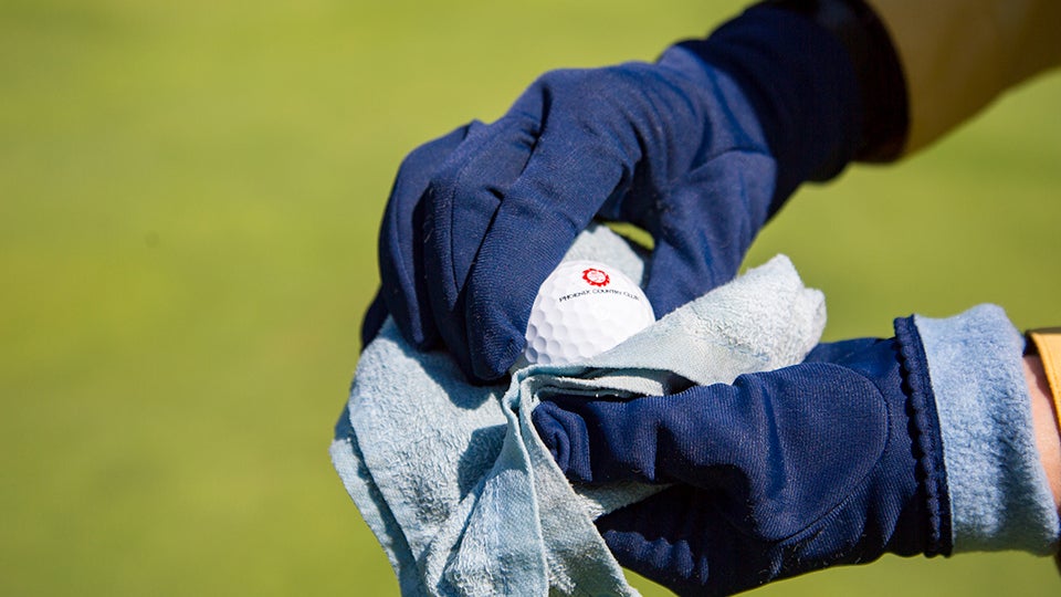 ボールに泥などついていると、転がりが悪くなるので、グリーン上ではボールをきれいに拭きあげます。