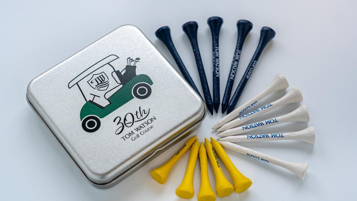 ショートティ(黄) ・レギュラーティ(白)・ロングティ(青)各5本ずつの計15本が入ったウッドティセット。缶は、トム・ワトソンゴルフコースで使用しているカートをモチーフにデザインしました。